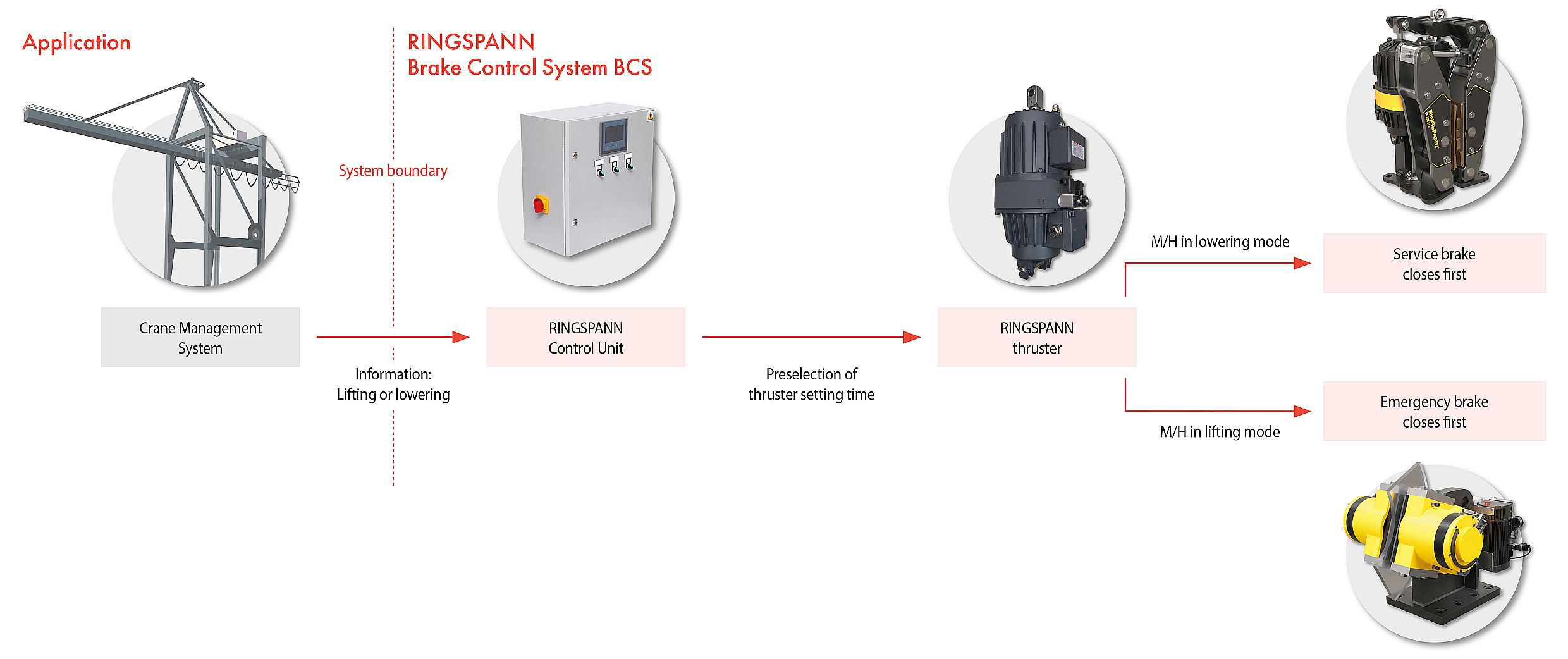 The flank change of the transmission gears of the main hoist is a negative effect that occurs during emergency stops. First of all, it should be noted that the driving lifting force is the motor, but when lowering, the load acts as the driving force (the motor then only controls the movement and prevents free fall). To eliminate the change of flanks, it must now be ensured that the emergency stop brakes of the rope drum close first when lifting, while the electro-hydraulic service brakes on the output shaft of the motor have priority when lowering. "To achieve this, we have developed a stand-alone solution where the crane's control system only needs to provide the information on whether the crane is operating in lifting or lowering mode. Everything else is taken care of by an electrohydraulic thruster that closes with two preset closing times, and a control unit that selects the respective closing time in advance. The system is easy to integrate – both in new cranes and in retrofits," says Martin Ohler, Brake Business Developer at RINGSPANN.